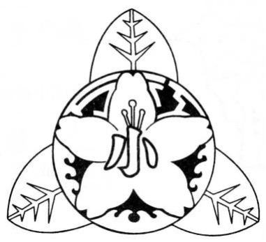 中央の花弁と外側の三枚の葉は、村花ツツジを図案化したものである。