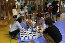 まず山江村教育委員会からマリーコールド、ガザニア、サルビア、ペチュニアの種を贈呈していただきました。そのあと、児童全員でプランターやポットに丁寧の種を蒔きました。