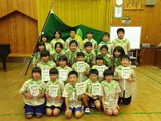 式では、会長の保護者の方や村の担当者の方から励ましの言葉をいただいたあと、団長が会長さんからみどりの少年団の団旗を受け取りました。