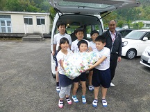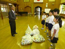 万江小学校では、以前からリサイクル活動の一つとしてペットボトルキャップを回収しており、毎年この時期に村の社会福祉協議会に贈呈をしています。