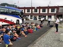 山江村役場の駐車場で出発式を行い、バスに乗り込みました。万江小山田小連合で長崎県に行き、平和について学習してきたいと思います。