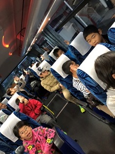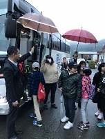 山江村役場の駐車場で出発式を行い、バスに乗り込みました。万江小山田小連合で長崎県に行き、平和について学習してきたいと思います。