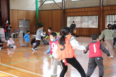 続いて「しっぽとり」。こちらはおなじみの鬼ごっこですが、1~6年生まで混合で行うということもあり、しっぽの長さを学年で変えるなど工夫をしました。