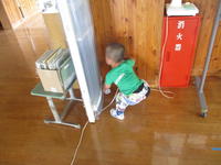 ⑤電子黒板の下に潜り込んできれいに拭いている1年生と4年生