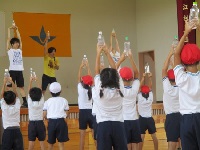 給食も全員でランチルームに集まって食べ、昼休みには多くの児童が運動場に出て元気に駆け回りました。そして5時間目は、9月に同じく山田小で開催される文化芸術公演に向けた「事前ワークショップ」があり、山田小の1~3年と万江小の全員でダンスをして、楽しく汗を流しました。