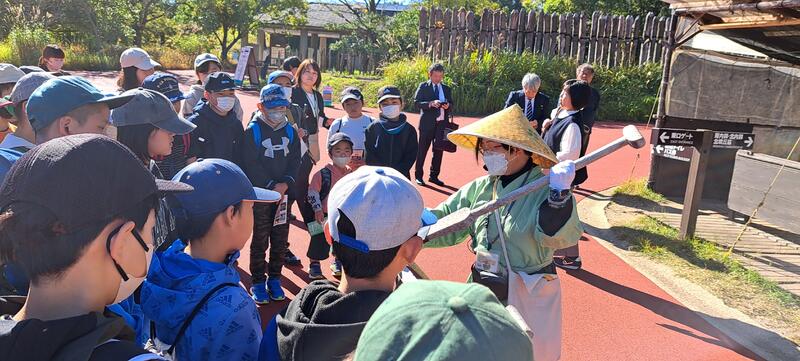 吉野ヶ里遺跡で学習中。ガイドさんのお話を聞いています。