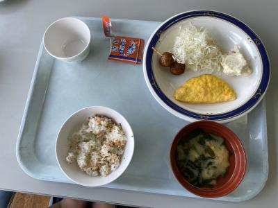 メニューは、ご飯、味噌汁、オムレツ、ミートボール、サラダです!
