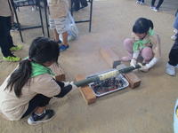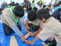 他の学校の団員とも交流し、木を植え、椅子を作り、バウムクーヘンを焼いておいしくいただきました。