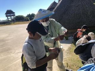 ボランティアガイドさんに石包丁の使い方を教えていただき、実際に草を切ってみました。いつでも弥生時代にタイムスリップして米の収穫ができます!