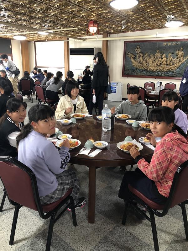 修学旅行1日目のランチはトルコライスです。カレーピラフ、トンカツ、スパゲッティにチーズタルトのデザート付きです。おいしい!