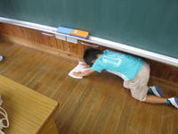 ⑤電子黒板の下に潜り込んできれいに拭いている1年生と4年生