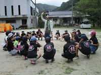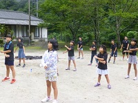 ○21日:開会式後に、まずボランティア活動として、グラウンドの除草作業を行いました。昼食はそうめん流し。保護者に竹を割って作っていただいた樋を流れる冷たいそうめんをおいしく頂きました。午後は万江川での川遊び。泳いだり、飛び込んだりして、山江地区の自然を満喫できました。夕食はカレーライス。ごはんは、飯ごうで炊きました。キャンプファイヤーでは班ごとに出し物をしたり、ゲームやフォークダンス、花火をしたりして楽しみました。しかし、途中からかなり強い雨が降り始めたため、昼間みんなで協力して準備していたテントで眠ることはできず、体育館で宿泊することとなりました。