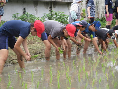 上級生が下級生や園児の手を引き、ぬかるんだ田んぼにおっこちないよう気を配りながら、なかよく田植えができました。