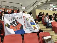 「頑張れ セルビア!」と書き、くまモンがシューター、