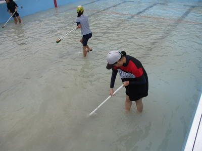 3~6年生は、プールの中とプールサイドをたわしなどで磨きました。