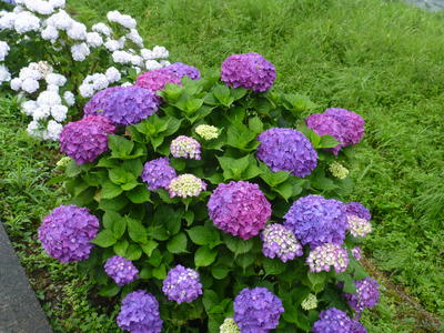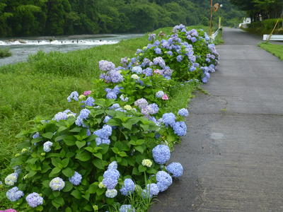 万江小学校のすぐ西側を清流万江川が流れていますが、その堤防沿いに、たくさんのあじさいが植えられていて、今とても美しい花を咲かせています。