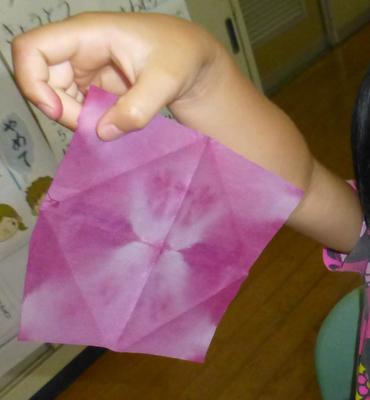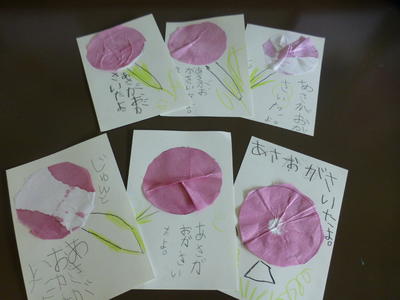 2枚目の写真は、朝顔の花をすりつぶしてできた色水で染めた和紙。