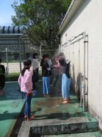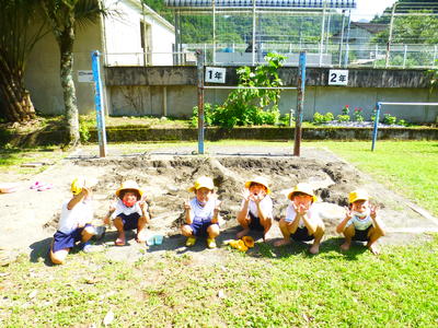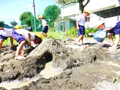 1年生が一生懸命穴を掘ったり、水をくんだりしています。