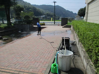 そこで、その隙間の土や草を根絶やしするために、高圧洗浄機でやっつけているところです。