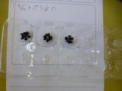 まだ算数では20までの数しか学習していませんが、卵パックを使って、10のまとまりを作り数えています。