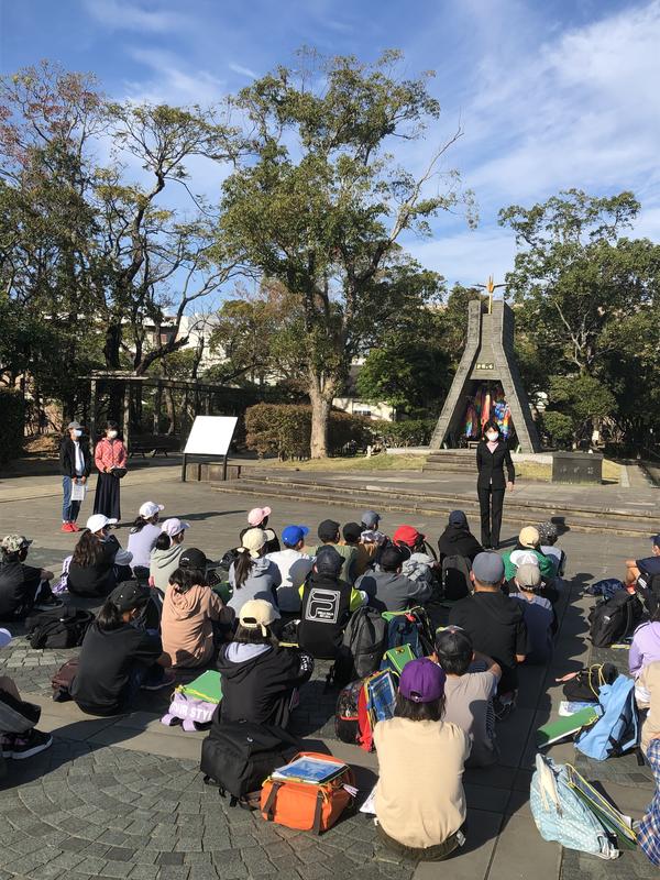 平和祈念像の前で平和集会を行いました。平和の願いを黙祷や誓いの言葉に込めました。