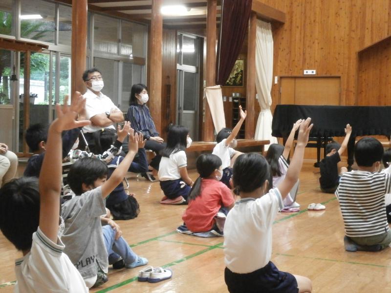 今週と来週は校内人権旬間です。その中の取組として人権集会を行いました。「万江っ子人権宣言」をみんなで言ったり、各学級の人権目標を発表したりしました。また、縦割り班でジェスチャーゲームを行い、1学期のテーマである「仲間づくり」の楽しさを味わいました。