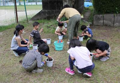 JAくまからゲストティーチャーをお招きし、1人ずつバケツに土と水を入れて苗を植えました。