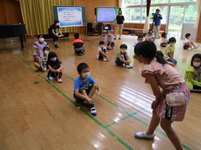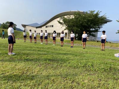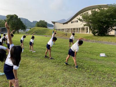 ラジオ体操や学校紹介を行い、気持ちのよい朝を迎えました。