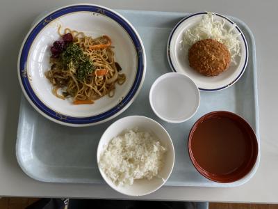 ごはん、焼きそば、わかめスープ、野菜コロッケでした!