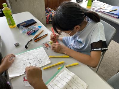 自分が好きなキャラクターなどをプラスチックの板に描いて、それをキーホルダーにしました。できあがった作品を見て、みんな満足気でした。