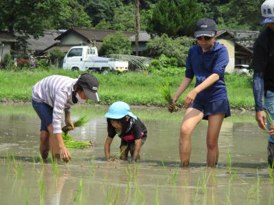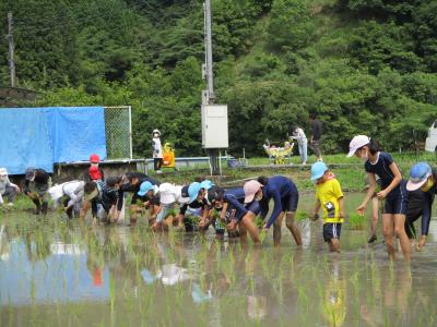 万江保育園の田植えに、5・6年生も参加しました。保育園の子どもたちとペアになって、赤い玉の印のところに苗を植えていきます。優しく教えたり、苗を手渡したりして、しっかりとお世話ができた子どもたちでした。もち米の収穫が楽しみです!