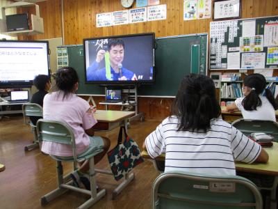 国際宇宙ステーションの星出彰彦宇宙飛行士と地上の油井亀美也宇宙飛行士の交信を、子どもたちは教室に居ながらタイムリーに観ることができ、向こうから出される質問に答えることもできました。