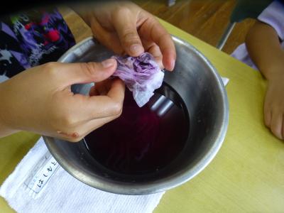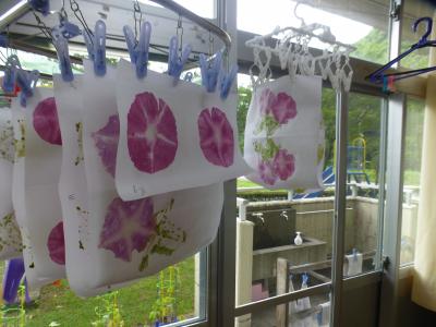 このきれいな朝顔を、とっておきたいという気持ちから、1年生は朝顔の花を和紙に染め出すことにしました。