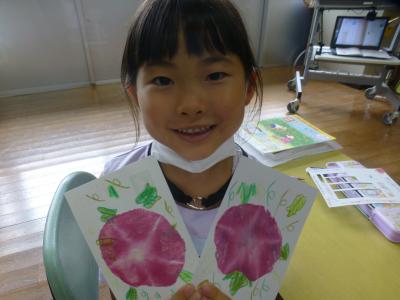 とってもきれいに出来上がり、せっかくなのでその朝顔を使って暑中見舞いはがきを作ることにしました。