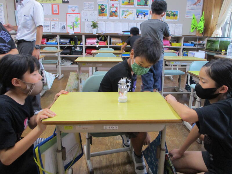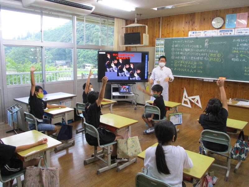 教室での準備の時から子どもたちは白衣姿の先生方に興味津々でした!!
