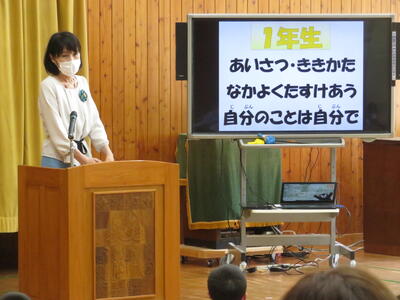 校長先生は、1学期の生活を振り返り、それぞの学年の目標とそれがどれだけできるようになっていたか、写真をたくさん使って、分かりやすく話してくださいました。