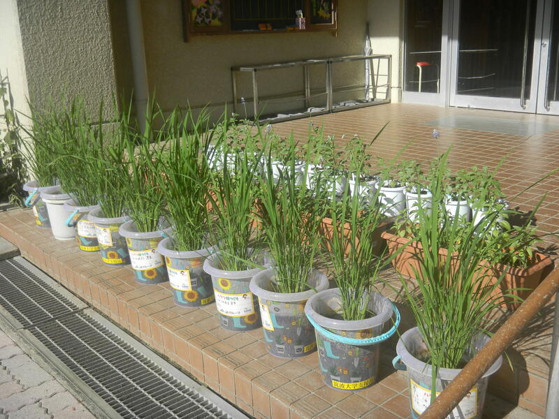 5年生が育てているバケツ稲。先日は水を抜いて中干しをしました。最近、ぐんぐん成長しています。夏休み中は、職員でしっかりお世話をしたいと思います。