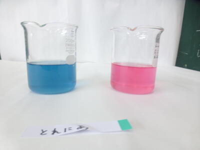 そして、先ほどの紫の色水に何かを混ぜると、このようなきれいな水色とピンクに変化するのです。