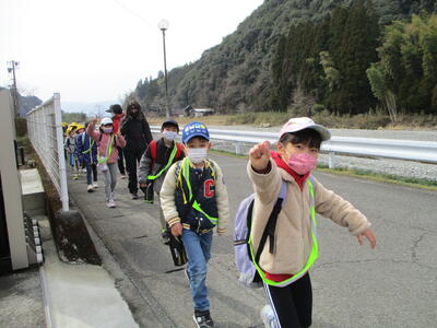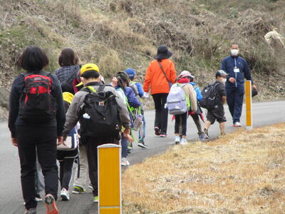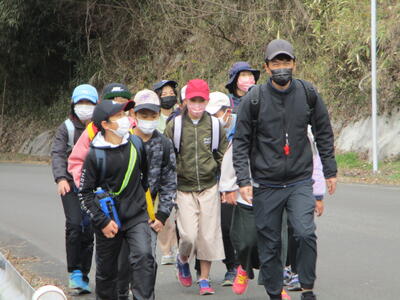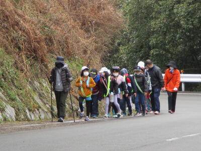 先頭は、3・4年生です。坂道をみんなで登っていきます。