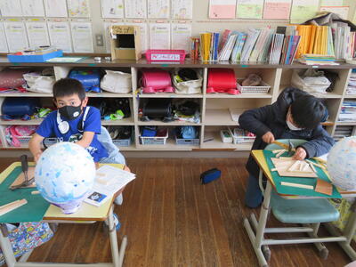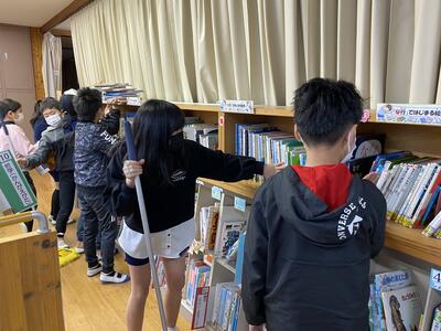 「6年間お世話になった万江小学校に少しでも感謝の気持ちを伝えたい」という6年生の提案で、5年生と一緒に学校の図書室の本の整理をしました。