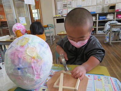 板をのこぎりで上手に切り、金づちで釘をトントン。