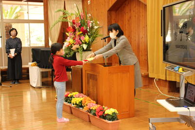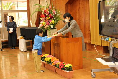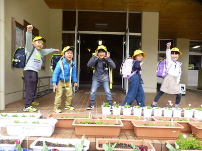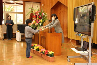 低学年の児童は、明日の卒業式に参加はできませんが、心を込めた花でお祝いできてとても喜んでいます。