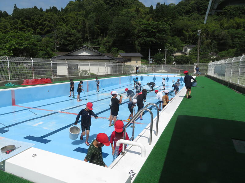 先週の金曜日にプール掃除をしました。午前週が1~2年生が更衣室やトイレを、午後からは3~6年生がプール内を掃除しました。今年は、用務員の方々に前もってプールサイドや排水溝の掃除をしていたいており、大変助かりました。もちろん、子どもたちもブラシで壁や床を磨いたり、バケツに水をくんできて汚れを流したり、一生懸命がんばりました。おかげでプールはピカピカになりました!後はプール開きを待つだけ。水泳学習が待ち遠しいです。