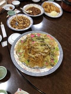 皿うどん、麻婆豆腐、春巻きなど円卓を