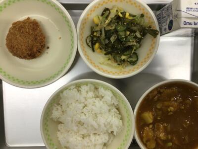 ごはん、牛乳、南関突破カレー、とんかつ、茎わかめのサラダ