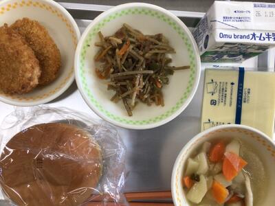 食パン、牛乳、ポークビーンズ、鮭キャベツカツ、グリーンサラダ、ミカンジャム