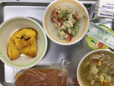 ミルクパン、牛乳、ポトフ、トマトオムレツ、花野菜サラダ、ラフランスゼリー
