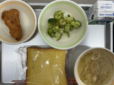 人参パン、牛乳、新たまねぎのスープ、あじごまフライ、甘夏みかんサラダ
