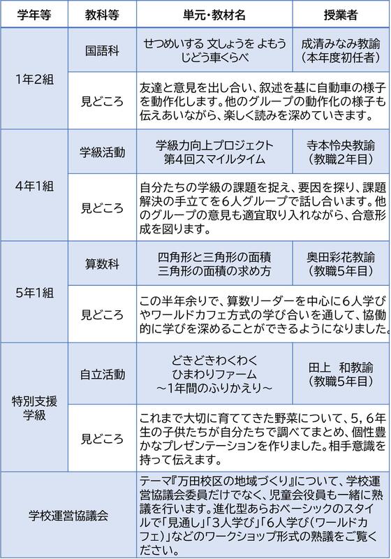 第二次案内にも掲載していましたが、研究発表会時の公開授業及び公開学校運営協議会の見どころを一覧でまとめています。