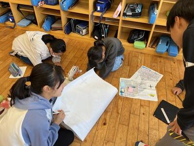 【特別支援学級教室前ホールで確認をする様子】